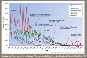 Take a good look at the graphs of these documented mortality rates in England and Wales from 1838 to 1978, well into the years that these ever-popular vaccinations were invented and mass administered to the populace. We see now, in plain sight, the mass illusion that was perpetrated on the public that vaccines were the saving grace for humankind, and saved billions of injected people from dying from the world’s scariest infectious diseases.
